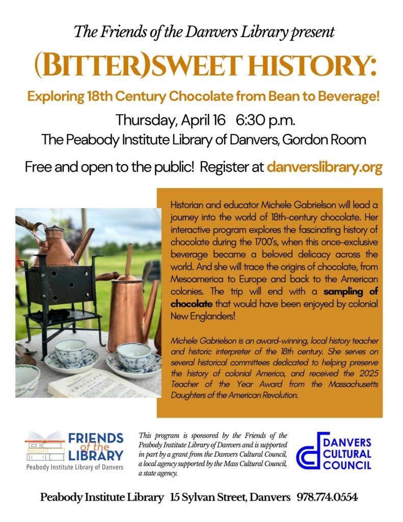 This program is sponsored by the Friends of the Peabody Institute Library of Danvers and is supported in part by a grant from the Danvers Cultural Council, a local agency supported by the Mass Cultural Council.